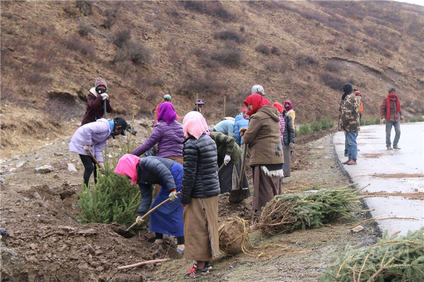 4月10日,记者途径国道317线甘孜县境内路段,沿途遇到了数支正在冒雨植树的群众队伍、多辆正在拉运树苗的农用车和几台正在挖植树坑的挖掘机。部分地段的公路两旁已经植上了成排的云杉,还有人正在浇水。
